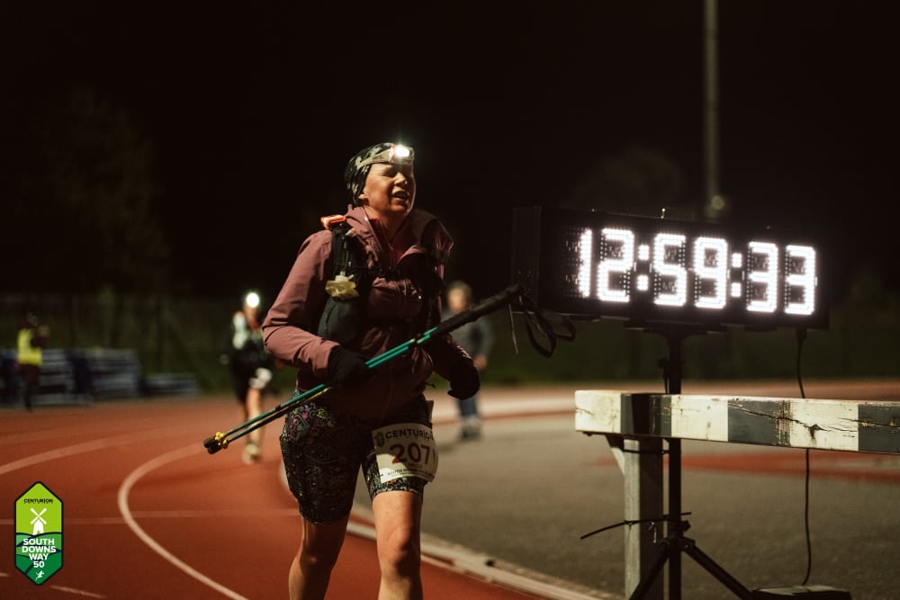 As the day wore on, it was PB central in the windy, overcast and fast conditions. One runner missed the final cut off at the 46 mile aid station at Jevington, leaving a group of four at the back of the pack, seemingly likely to miss out on an official finish under the 13 hour cut off, some of them by mere seconds. But with less than 45 seconds left in the race, first one, then two and three almost together came over the line, leaving just Tabitha Codd sprinting for the line. She crossed with 2 seconds to spare in 12:59:57, leaving us the perfect end to a brilliant day. Thank goodness for that!