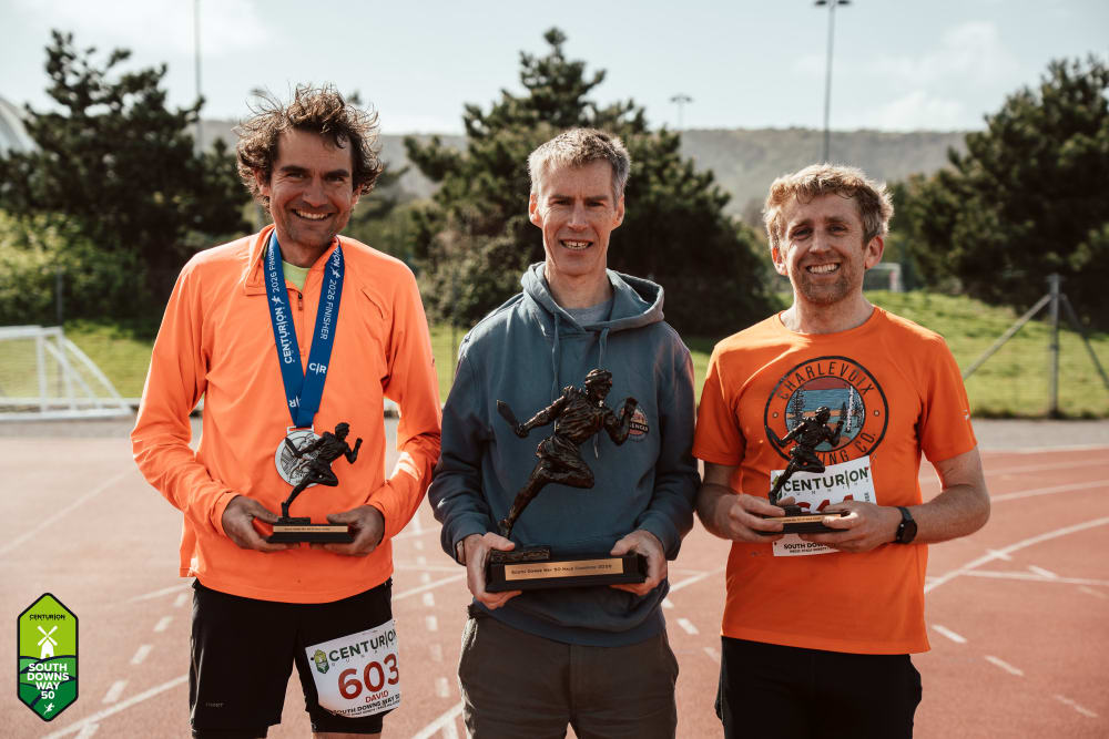 The mens race shaped up differently, with 2025 second place finisher Matt Hammerton going out hard with David Green - 2025 Autumn 100 second place his last ultra outing. The two gradually shed the rest of the field and it became a real tactical battle with Matt filling flasks from SDW public taps to save seconds in one or two of the check points. He took a small lead out of Housedean Farm, the marathon mark, and stretched it to a maximum of four minutes going into the final third of the race. From there, David ran at least as strong and pushed Matt all the way. With the final miles coming into view, it was only then that the dream of breaking Tom Evans' 8 year old course record of 5:44 finally faded for the pair. Matt crossed the line first in 5:47 for the second fastest 50 mile trail performance we have seen in 14 years of racing. David came across four minutes later in 5:51 to put himself third on the same list. Third place went to Paul Grieve in 6:32, who dug deep to fend off a large group of guys all pressing home to finish in 7 hours or less.